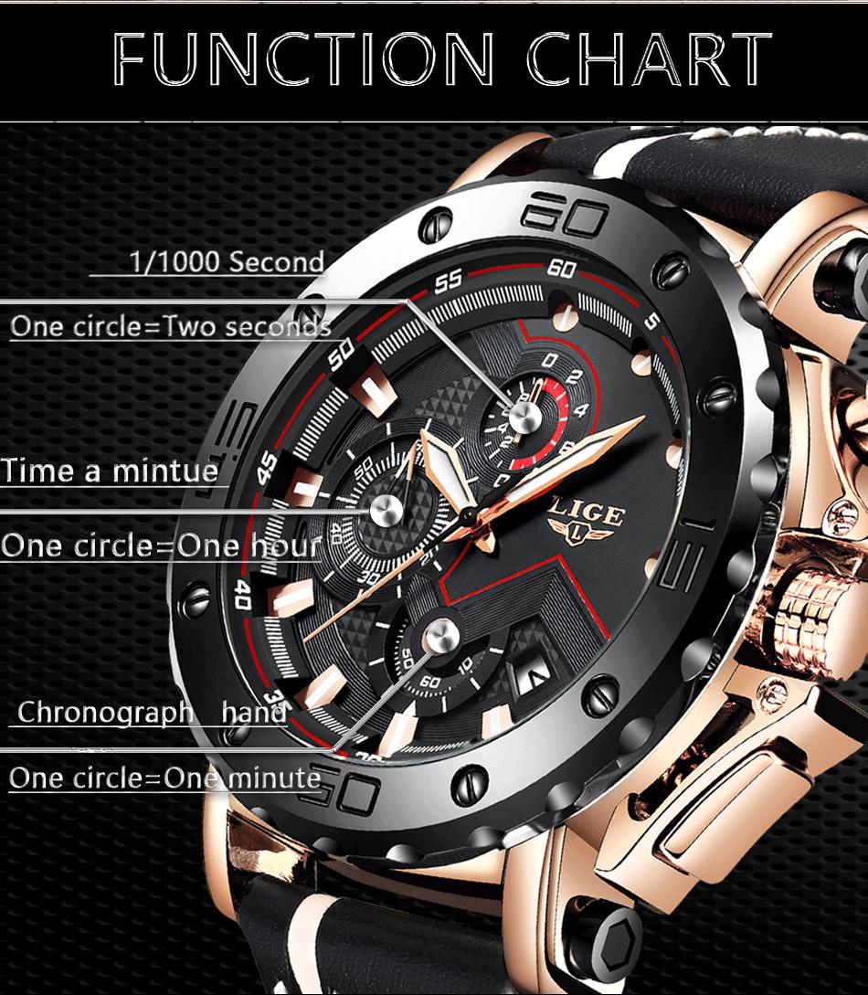 Perfect for Gifts!!!Product Details-NewwithtagandBrand:LIGEModel:LG9899Watchtype:menStyle:Sports,Casual,FashionluxuryCaseDiameter:47mmCasethickness:15mmBandwidth:22mmTotalLength:21cmCase material: stainless steelStrap material: silicone strap Features:Watch materialJapan imported quartz and battery, can provide accurate time and three-year battery life. It is also easy to replace the battery.Multi-function watchAll small dials and buttons can work normally. Gold-plated IP box never fades; chronograph automatic date etc.3ATM waterproof: 30 meters waterproof in everyday life, usually can withstand splash or short-term immersion in water.Luminous watch: This model used the fluorescent powder which need absorb enough high light before they can glow in the dark.Gifts: The watch is suitable for every occasion (outdoor, business, party), also a great gift for family and friends.Perfect gift box , this wrist watch will be a perfect gift for yourself or for that special someone.Package contains:1 x User Manual1 x Wiping cloth1 x Original Watch1 x Black Brand Watch Box1 x watch band Adjustment tool