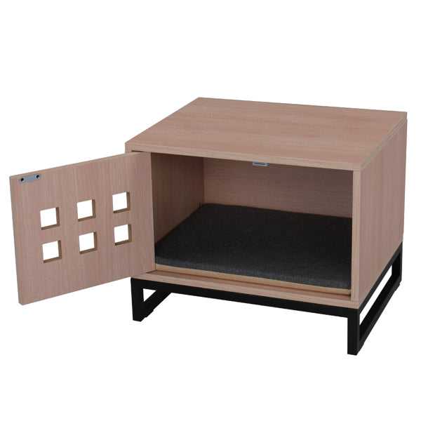 Cat door & hinged door design: Cat door is fixed with a decorative cat hole allowing your cat to come and go as it pleases. The interior may also be accessed by opening the hinged door to insert a pet bed and litter box when needed