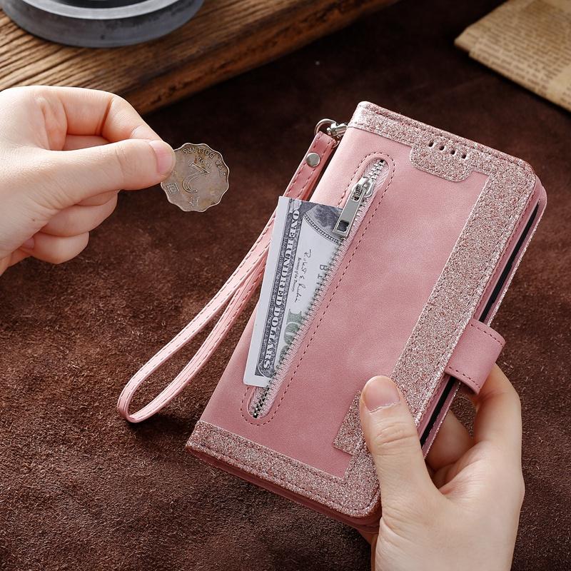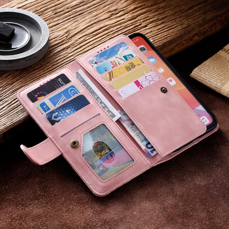 Type : Wallet CaseFeatures : Anti-FingerprintFeatures : Anti-ScratchFeatures : Card PocketFeatures : Dual LayerFeatures : DustproofFeatures : With holderFeatures : With LanyardFeatures : Matte/Anti-GlareFeatures : Non-SlipFeatures : Water-ResistantDesign : PlainDesign : GlitterType : Multi-function Wallet Phone Bag CaseMaterial : High Quality Matte PU LeatherFeature 1 : Fashion Glitter Powders Phone BagFeature 2 : Leather Case with Stand HolderFeature 3 : Three-tier Zipper Wallet with 9 Card SlotsFeature 4 : Flip Covers with Magnetic BuckleFeature 5 : Phone Case with Leather Hand Strap