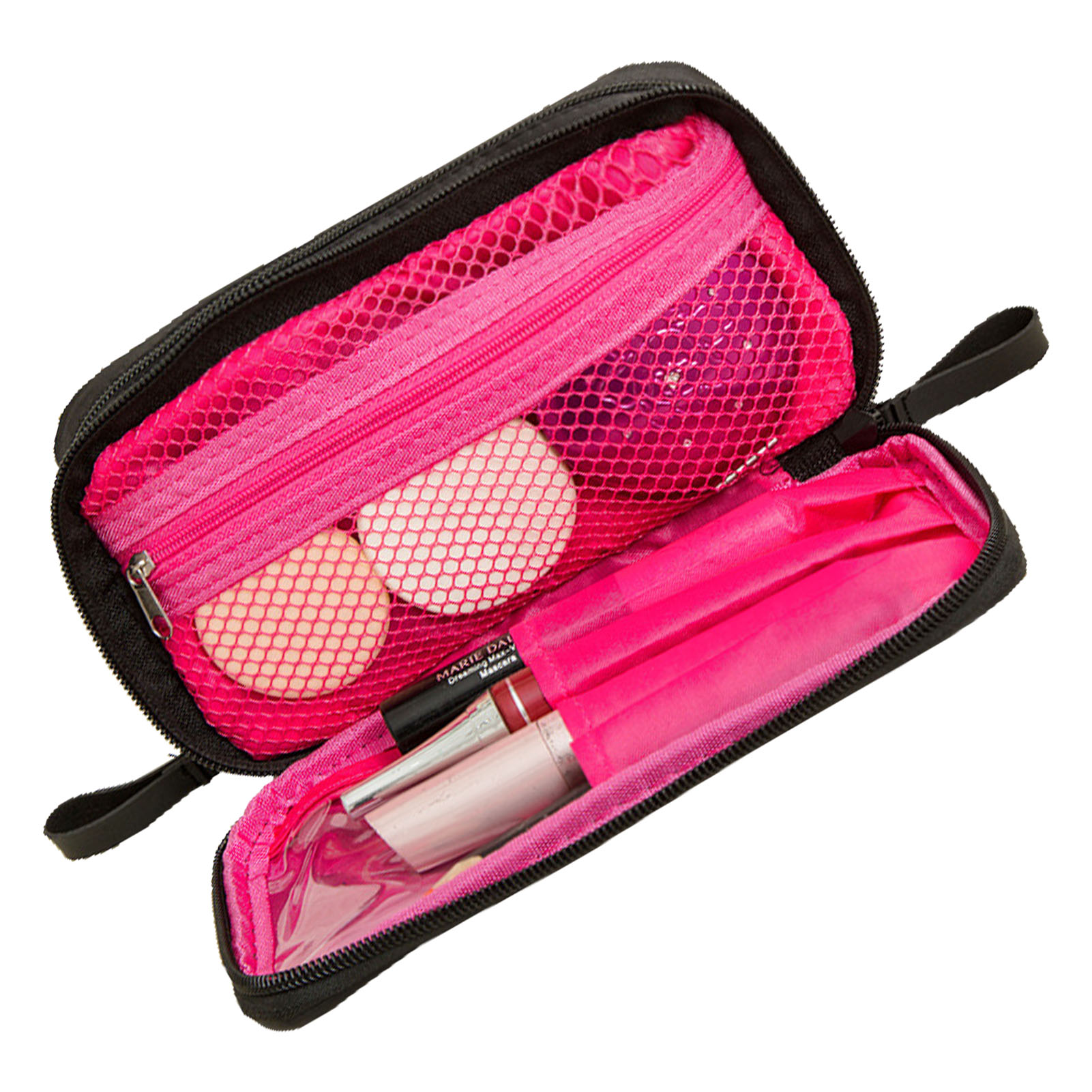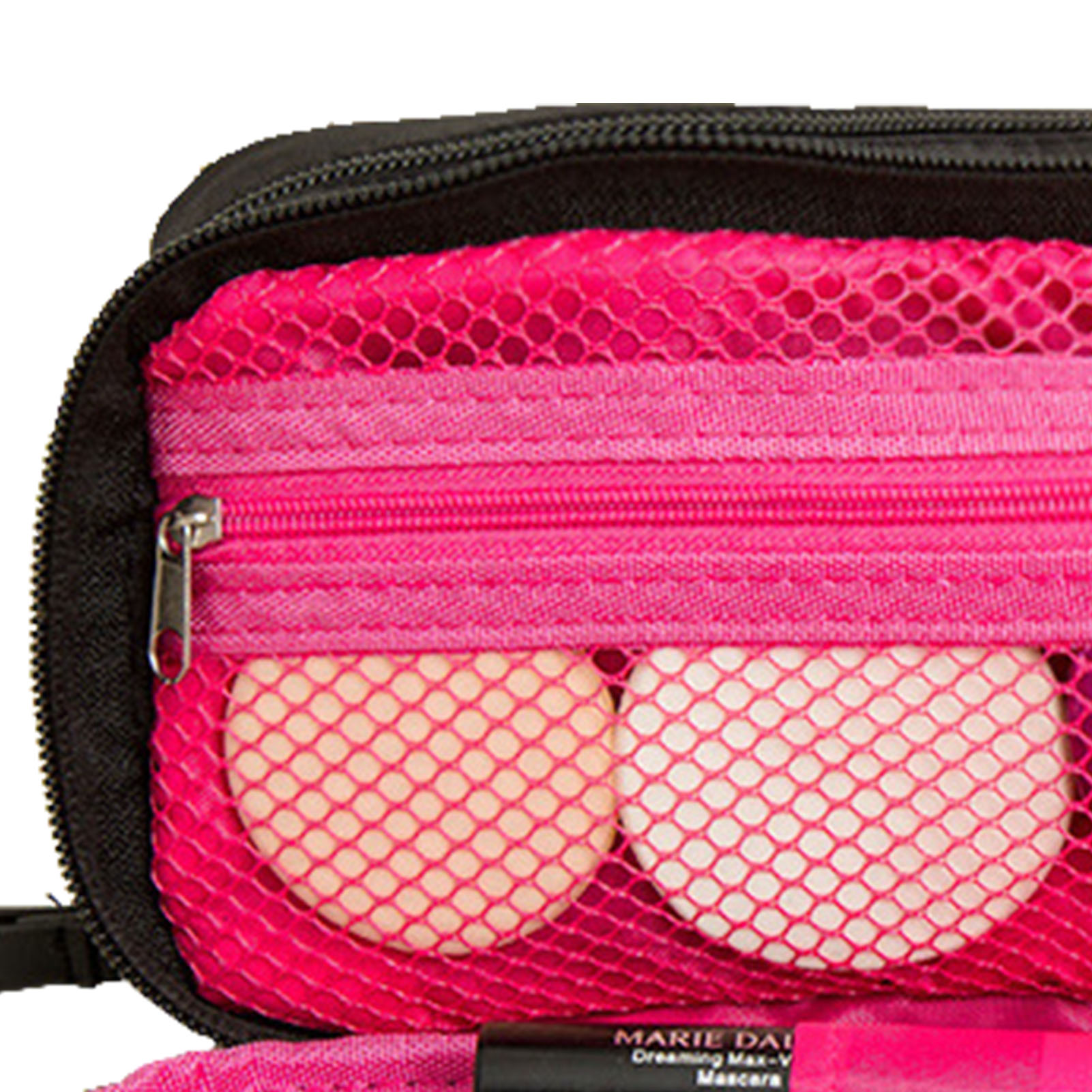 1Double Zipper: Travel makeup bag with double zipper closure, which ensures that the usual cosmetics can be reliably stored 2Compartment Design: Cosmetic storage case has an internal compartment design with 4 brush pockets on the left and a large zippered mesh pocket on the right 3Portable and Light: The cosmetic pocket has a portable and light design, which is convenient for you to carry when you go out or travel 4Large Storage Capacity: The makeup bag has large storage capacity, which can be used to store watches, earrings, rings, cosmetics, etc 5Nylon Cloth: The cosmetic pocket is made of nylon cloth material, which is wearable and durable, and has a long service life