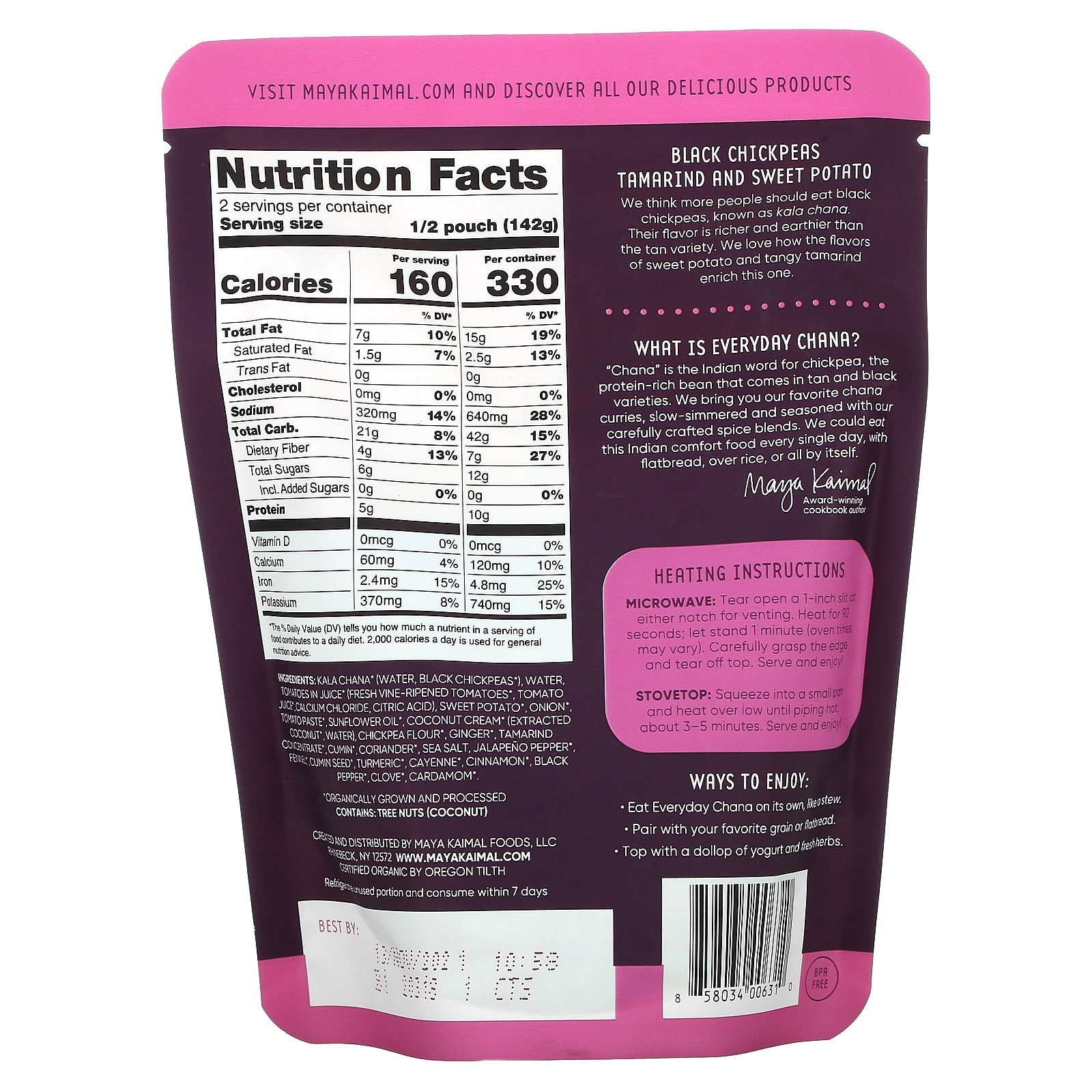 Kala choana* (water, black chickpeas*), water, tomatoes in juice* (fresh vine-ripened tomatoes*, tomato juice*, calcium chloride, citric acid), sweet potato*, onion*, tomato paste*, sunflower oil*, coconut cream* (extracted coconut*, water), chickpea flour*, ginger*, tamarind concentrate*, cumin*, coriander, sea salt, jalapeno pepper*, fennel*, cumin seed*, turmeric*, cayenne*, cinnamon*, black pepper*, clove*, cardamom*.