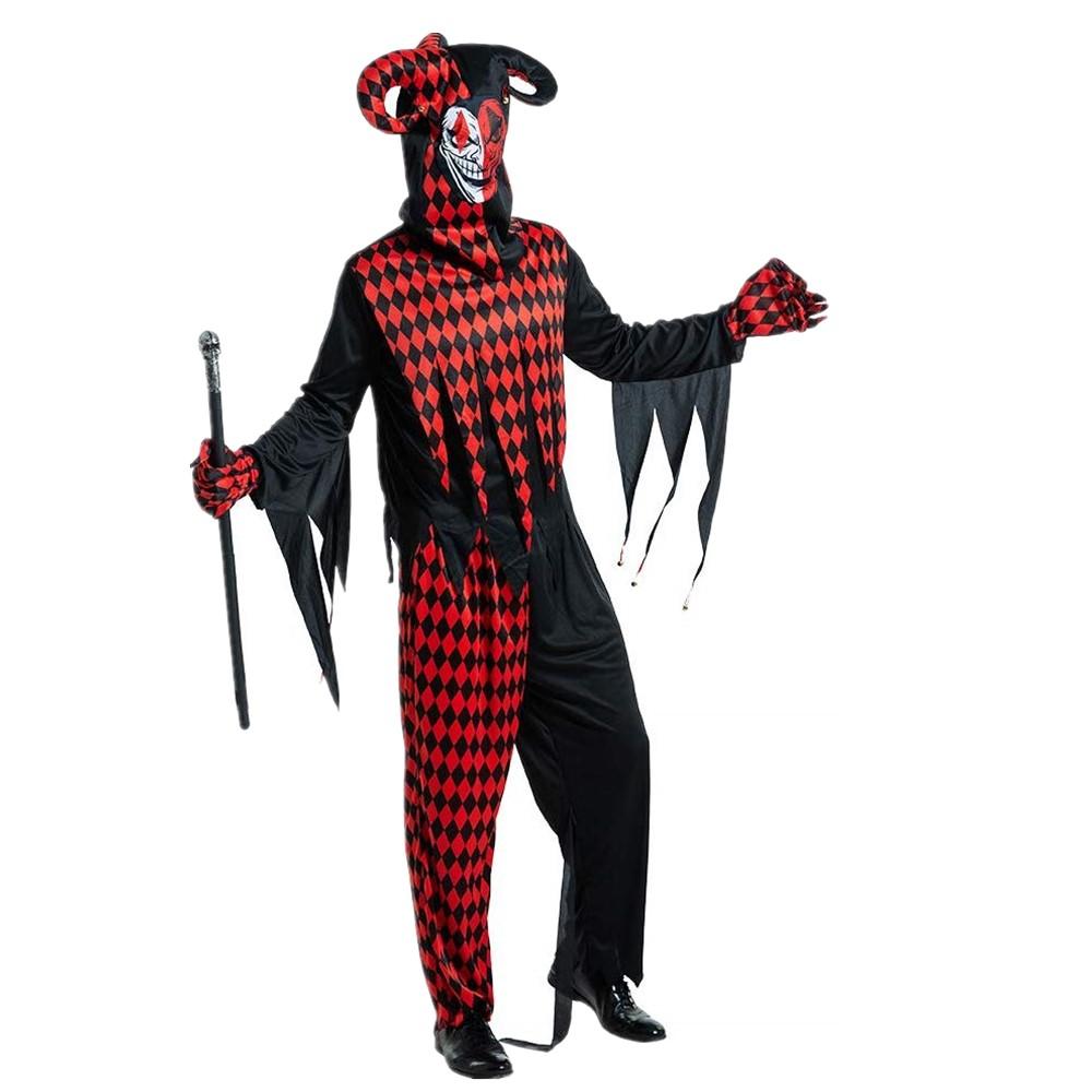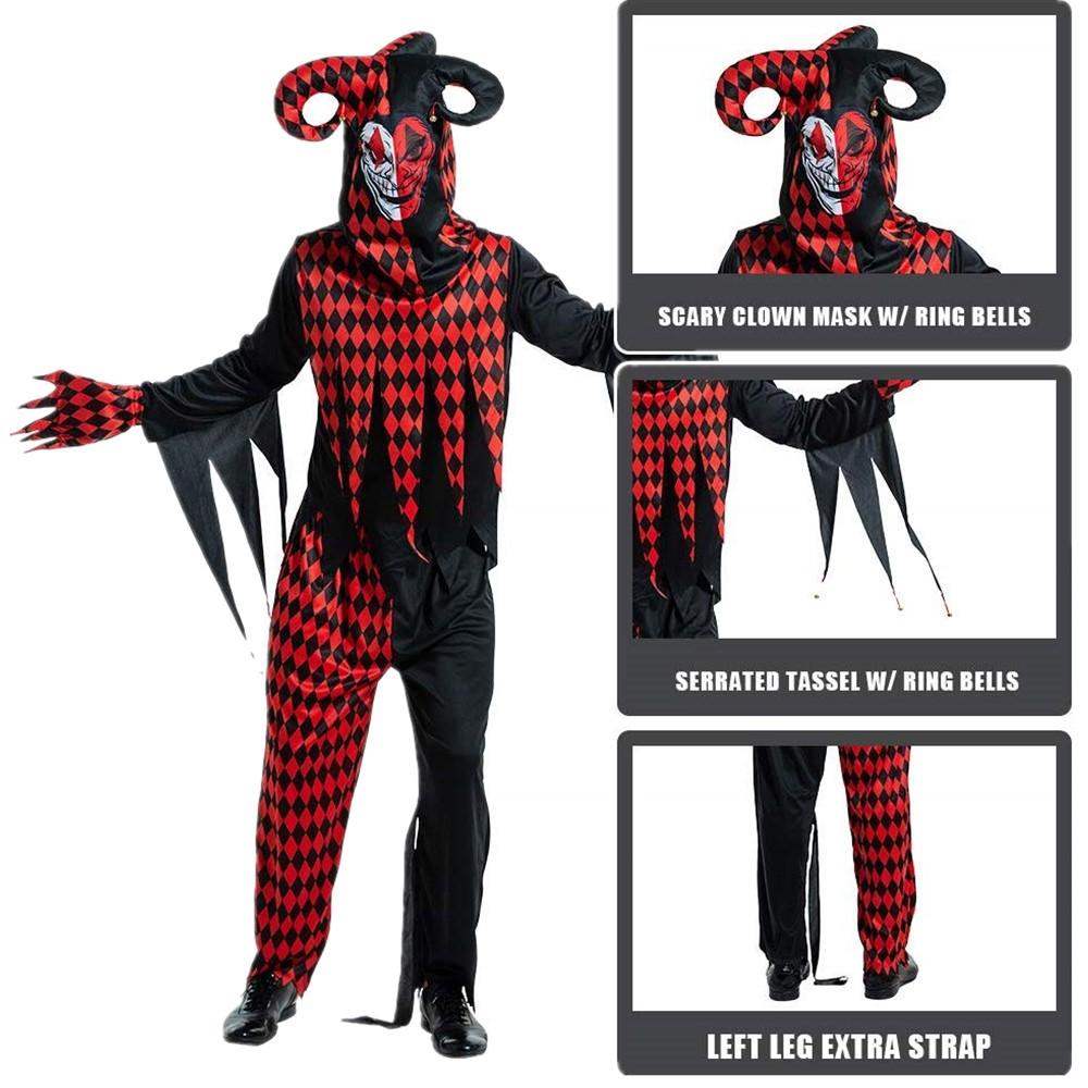 Material:PolyesterCreepy Mask - This clown costume has a smiling-face mask. But it is not as friendly as normal clown face. It is creepy smile.Red and Black Color - Half red color and half black color. It is just like red blood appearing in the dark night.Complete Equipment - The fancy clown costume including head mask, face mask, jacket, trousers and gloves, equipping you as a real jester from head to feet.Suitable for Men and Older Children - Good choice for Halloween or any cosplay parties. Wear the scary adult clown outfit and enjoy yourself.Package Includes -Head mask, Face mask, Jacket, Trousers, Gloves. Note: Hand wash only with cold water. Line dry only. Do not bleach. Do not dry clean.Size(CM):M:CHEST 110CM, SHIRT LENGTH 76CM, WAIST 60-75CM, PANTS LENGTH 103CML:CHEST 120CM, SHIRT LENGTH 78CM, WAIST 66-81CM, PANTS LENGTH 107CMXL:CHEST 136CM, SHIRT LENGTH 80CM, WAIST 72-87CM, PANTS LENGTH 111CM