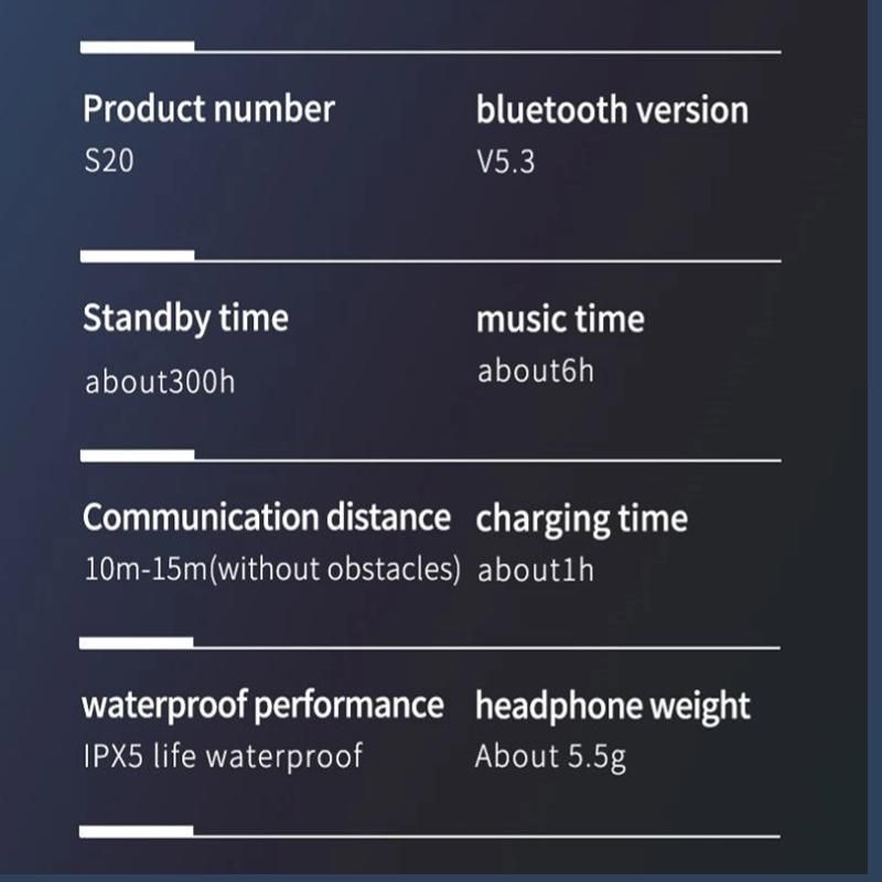 Specification:Name: Ear Clip Bluetooth HeadphonesProduct Model: S20Bluetooth program: Zhongke Lancel V5.3Bluetooth version: 5.3Earphone type: Ear hookMicrophone: YesNoise Reduction: ActiveWaterproof: YesPlayback Control: YesProduct speaker: 10MM copper ring speakerMusic Time: 6hCharging Time: 1hLong Standby Time: 200hCommunication distance: 10-15 meters without obstaclesFunctions: ultra-long endurance, call function, voice control, music support, low delay of E-sportsHeadset battery capacity: 50mAhProduct net weight: 5.3g (bare)Pouch weight: 15gWaterproof performance: IPX5Single Ear: Unilateral HandsfreeFeature.Touch ControlIPX5 WaterproofHiFi SoundHD CallNoise ReductionPackage Includes:1x Headset (one side)1x Micro charging cable1x Chinese and English manual