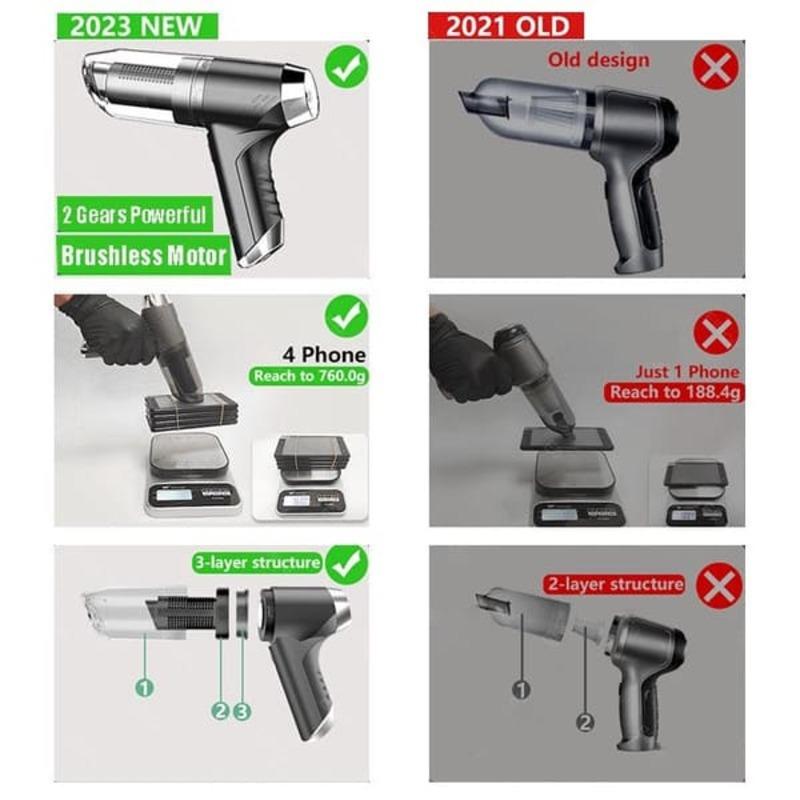Product description:Name: Wireless Car Vacuum CleanerColor: Green/BlackMaterial: ABSSize: 190*170*70MMNumber of gears: 2nd gear adjustment[Motor]: New upgrated Brushless motor[Vacuum degree]: 120000PA[Rated speed]: 45500rpm[Capacity of lithium battery]: 2 * 2000mAh[Charging mode]: Type-C charging line[Rated power]: 75W[Noise]: 52dB[Operating temperature]: - 20 ~+50 Product function: mainly cleaning the car, vacuuming, blowing dust, blowing balloons, etc.Characteristic:1. Intelligent AI variable frequency motor2. Silver ion antibacterial and dirt resistant material3. Dual filtration system4. Three layers of high-density filter element, reusable5. Ultra durable battery, the same type of battery cell as Tesla6. Germany's advanced CLEAN mite removal technology7. Pure copper dual motorPackage list:Vacuum cleaner X1Accessories 6Charging cable X1Instruction manual X1