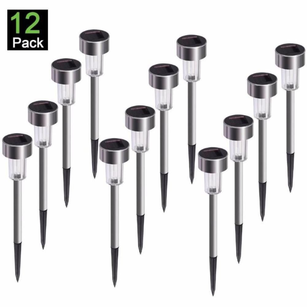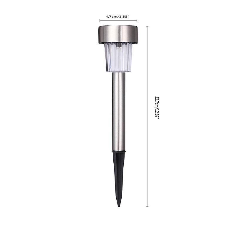 Feature:Premium quality stainless steel bright white LED solar lights. Adopt latest improved solar panel, provides better performance andprolonged usage time. The solar panel converts sunlight during the day time and recharge the battery. At night the light turn on automatically. Light assemblies, stake sections, connectors, and durable ground spikes are included. This energy-efficient, low-maintenance solar lights add a charming, decorative glow to your driveway, patio, or flowerbeds.Solar Battery:2V 40mARecharged by solar panels under sun lightLight color:white,warm white,multipleMaterial:ABSSize:Dimension: Height: 29.5cm, Diameter: 4.5cm.CE certifiedLED can last up to100,000 hoursAutomatic sensor activates at duskLights up to Ten (8) hours if fully chargedOFF/ON SwitchSafe Water ResistantPackage included:1/4/6/8/12 pcs solar lampThanks for reading!Product type: Lawn Lamps