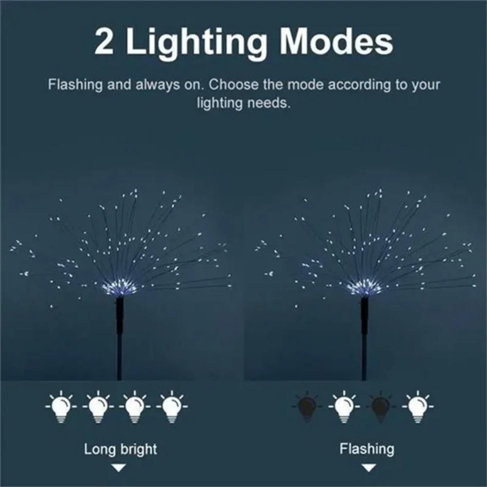 Feature:1.Solar Powered: It will automatically off to recharge during the day time and illuminate automatically when it gets dark. It's totally solar-powered, with no wires or external electricity required so as to save energy.2.High Quality& IP65 Waterproof :60LEDs brighter,more styling possibilities. copper wire material, ABS plastic, safe, temperature resistant and anti-shock.3. 2 Lighting Modes: Flashing and always on. Choose the mode according to your lighting needs.4.Ideal Decoration: These copper wires are flexible,DIY your favorite shapes such as flowers, trees, fireworks, Ferris wheels, hearts, spirals, spheres, etc.5.Wide Application: Suitable for decorating the Garden, Backyard, Sidewalk, Flower beds, Fences, etc. It's also the unique decor for Christmas, Halloween, Thanks Giving Day.Specification:Lighting Color: White / Warm White / Colorful (Optional)Length: 100cmWaterproof Grade: IP65Mode: 2 ModesCharging Method: Outdoor solar charging for about 6-8 hours Lighting Time: About 8-10 hoursWorking Mode: Light control sensor with switchApplication: Garden, courtyard, lawn, road, swimming pool, etc.Package Included:1Pack= 1* Solar Lawn Light2Pack= 2* Solar Lawn Light4Pack= 4* Solar Lawn LightQ&A:Question 1:In description: ...batteries are sealed & not replaceable. . in product info: 2 aa required (included). if solar then why need batteries?Answer:Solar lights use batteries in this way, during the day the sunshine recharges the batteries so they light up at night. I have these lights and they are beautiful.Question 2:Do lights turn on/off by themselves or must they be set by hand?Answer:There is an on / blink / off switch. If you turn it to the on position they go on at dark and go off at sunrise.