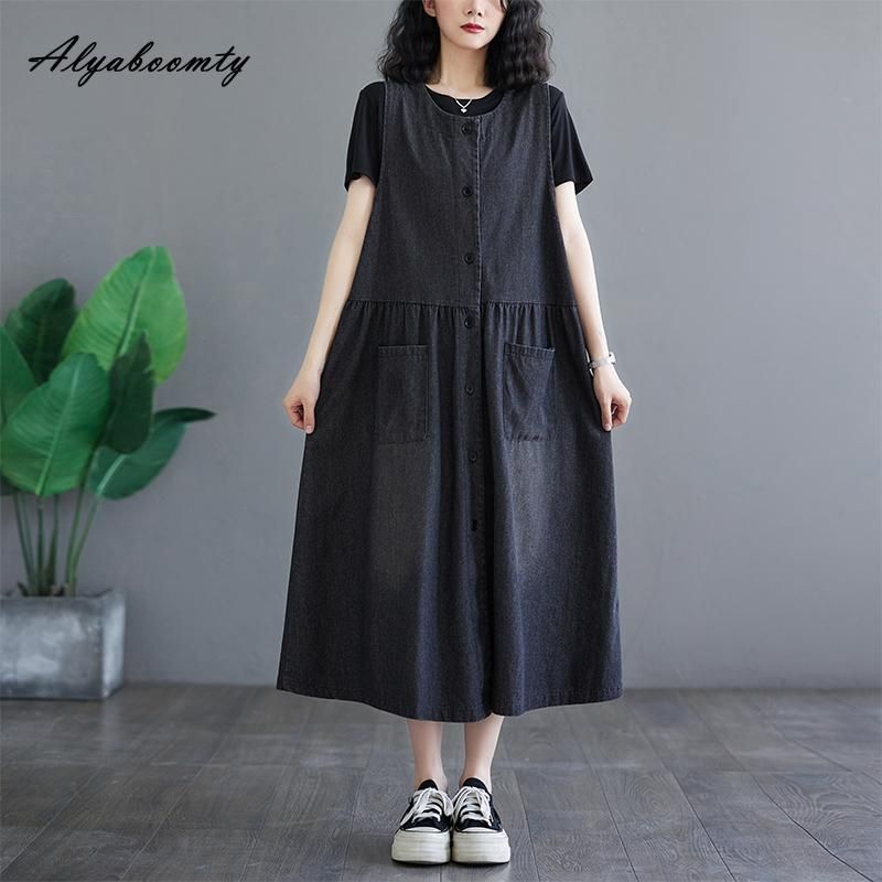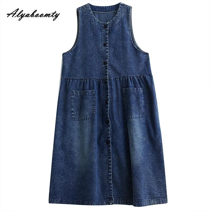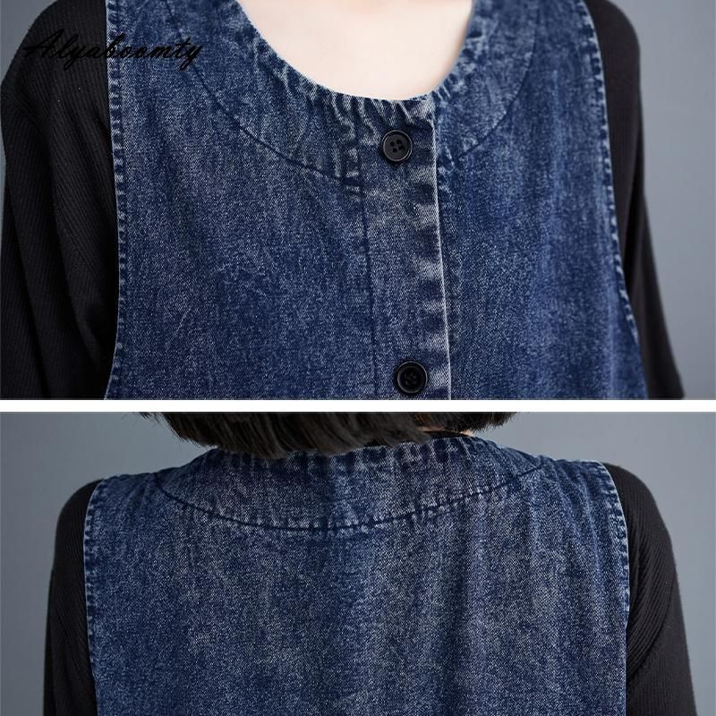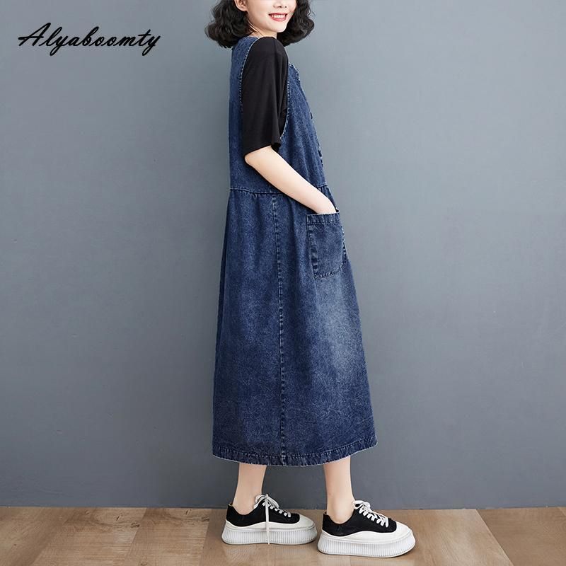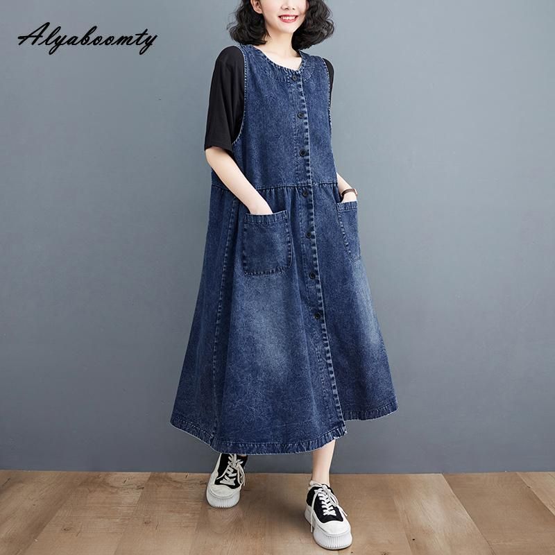 Size:M,Shoulder:34cm,Bust:112cm,Waist:108cm,Hips:146cm,Length:107cm;Size:L,Shoulder:35cm,Bust:116cm,Waist:112cm,Hips:150cm,Length:108cm;Size:XL,Shoulder:36cm,Bust:120cm,Waist:116cm,Hips:154cm,Length:109cm;Size:XXL,Shoulder:37cm,Bust:124cm,Waist:120cm,Hips:158cm,Length:110cm.Fabric Type : DenimSeason : Spring,Summer,AutumnNeckline : O NeckWaistline : Natural FactorsSleeve Style : TankDresses Length : Mid-CalfDecoration : PocketsSleeve Length(cm) : SleevelessPattern Type : SolidSilhouette : LOOSEStyle :Korean StyleMaterial : Cotton 100%Elasticity : Non StrechFit Type : LOOSELabel:YesWashing:Hand wash cold, Iron at normal temperature
