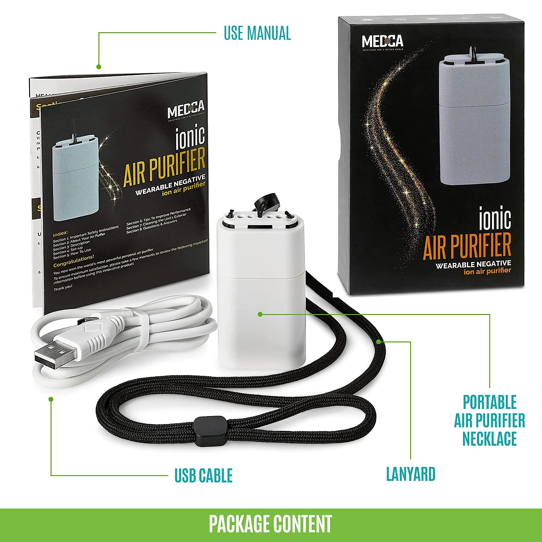 Go Everywhere and Do Everything in a Whole New Way If you've ever been on vacation to the country or went on a nature hike or camping trip, what do you notice when you get back to the city? It's probably the noise, or the fewer crowds, or all the greenery around you. It could also be the air that you breathe. Did you notice how cleaner and crisper the air was? Did you wish you could bottle it up and bring it with you? There is a way to have that fragrant and fresh air with you anywhere and that's with our Wearable Air Necklace. Relaxed. Refreshed. Renewed. Our air device brings you that feeling that you have nature around you. Imagine when you go out running, or you're in the gym. Wouldn't you benefit from breathing crisp air? The more oxygen you get, the better your body will perform. That's just one of the benefits you'll enjoy from our air necklace. Your personal space is important to you and that includes the air you breathe. It is most effective within 3 feet or 1 meter. Simple and Easy to Use Easy to charge and use. Ensure the device is off. Plug the device using the included USB cable into any powered USB port (laptop, wall socket, etc.). The indicator light will turn bright red while charging. To use, just press the power button and you're good to go. What's in the Box: 1 - Air Purifier Necklace Device 1 - USB Charging Cable 1 - Strap 1 - User Manual