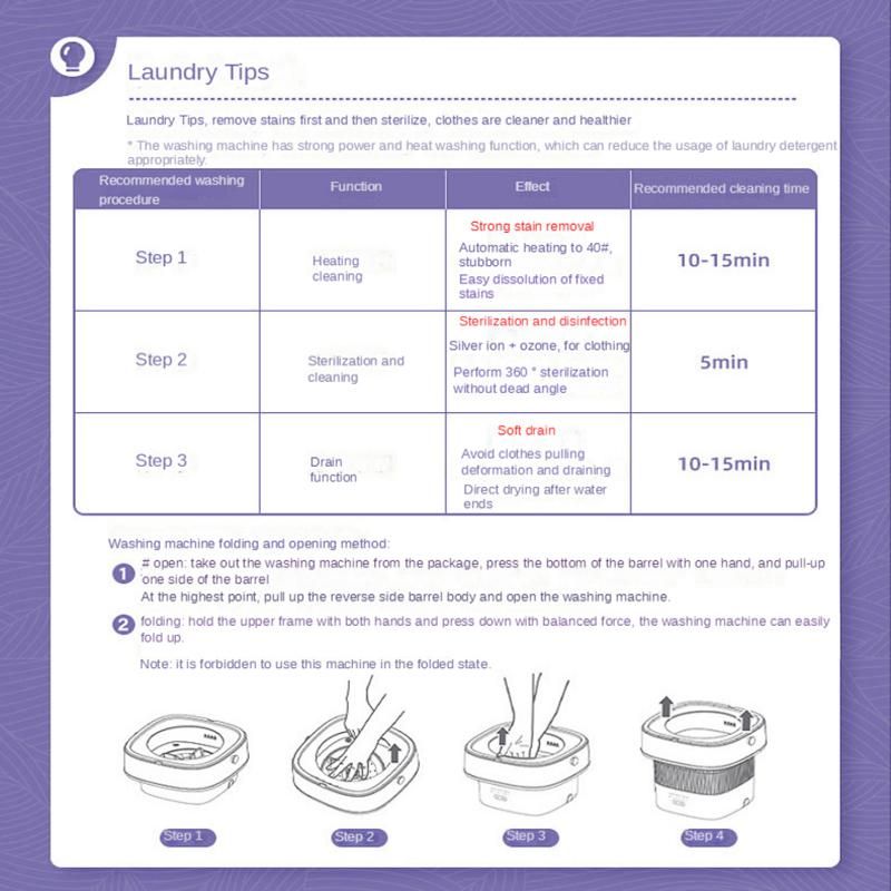 Portable Small Folding Washing Machine Underwear and Socks Washing Machine Ultraviolet Sterilizer Suitable For Business OutdoorProduct introduction1. [For small items only] Our mini portable washing machine is designed for delicate and small items. Its small load can save water and electricity, but cleaning large items will damage the machine.2. Durable food-grade TPE material: Our mini portable washing machine uses TPE material, which is the best choice for your personal products, baby products, pet products, fruits and vegetables3. It is light, easy to move and easy to store in small space. Our small washing machine will be an incredible gift for those who love cleaning, love food and health, travel frequently, live in school and have children, pets and patients.4. Our mini portable washing machine adopts silent technology. Our camping washing machine only needs 0.05 kilowatt-hour of power in the 10-minute washing process.