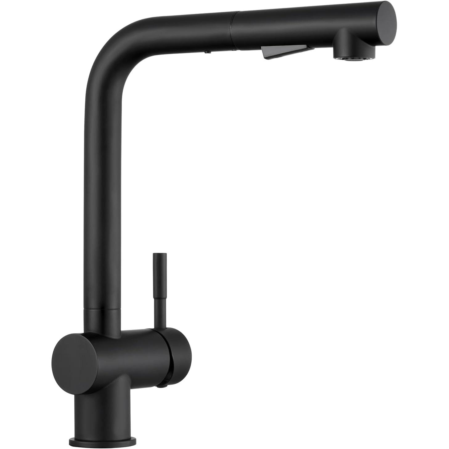Beautiful design: The matte Black kitchen faucet has a simple and elegant appearance, which is good for modern kitchens. The kitchen faucet with a relatively high water output is very convenient. The single-lever sink faucet is very light and easy to use. Two types of water jet: The extendable shower with switching function, the shower button allows you to easily switch between water jet and water jet. You can quickly wash fruits, vegetables and all kinds of dishes. 360 rotation range: The Black faucet fits perfectly with all sinks. The faucet can be moved flexibly and is ideal for deep cleaning of the kitchen sink. The kitchen faucet can be easily rotated 360 degrees, so when installing it, you can position the mixer lever to the left or right according to your habits. Excellent quality: The sink faucet is made of high-quality stainless steel (lead-free and rust-proof), it is also very durable. And the detachable ABS plastic shower head is easy to use. The ceramic cartridge can prevent water leakage and extend the life of the faucet, while you can change the water temperature and flow effortlessly. Easy to install: single hole, mounting hole diameter: 35-38mm. Applicable mounting plate thickness: 1-40mm. 2 50cm hoses and G3/8 universal connector. Even the sink faucet can be installed in a few steps. 1 2 3