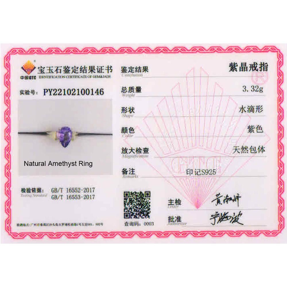 Item:925 silver Ring with natural gemstonesmaterial:925 silver,silver weight:approx.3.1gCenter stone:Natural African amethystGemstone Size:pear 8*12Gemstone Weight:approx.3.5caratGemstone quality:slight inclusion Gemstone Treatment:noneside stone:NoneRING SIZE CHARTUS RING SIZE:6# Approx.Diameter:16.3mm Cirumference:51.2mmUS RING SIZE:7# Approx.Diameter:17.2mm Cirumference:53.9mmUS RING SIZE:8# Approx.Diameter:17.8mm Cirumference:55.9mmUS RING SIZE:9# Approx.Diameter:18.4mm Cirumference:57.7mmUS RING SIZE:10# Approx.Diameter:18.9mm Cirumference:59.5mm