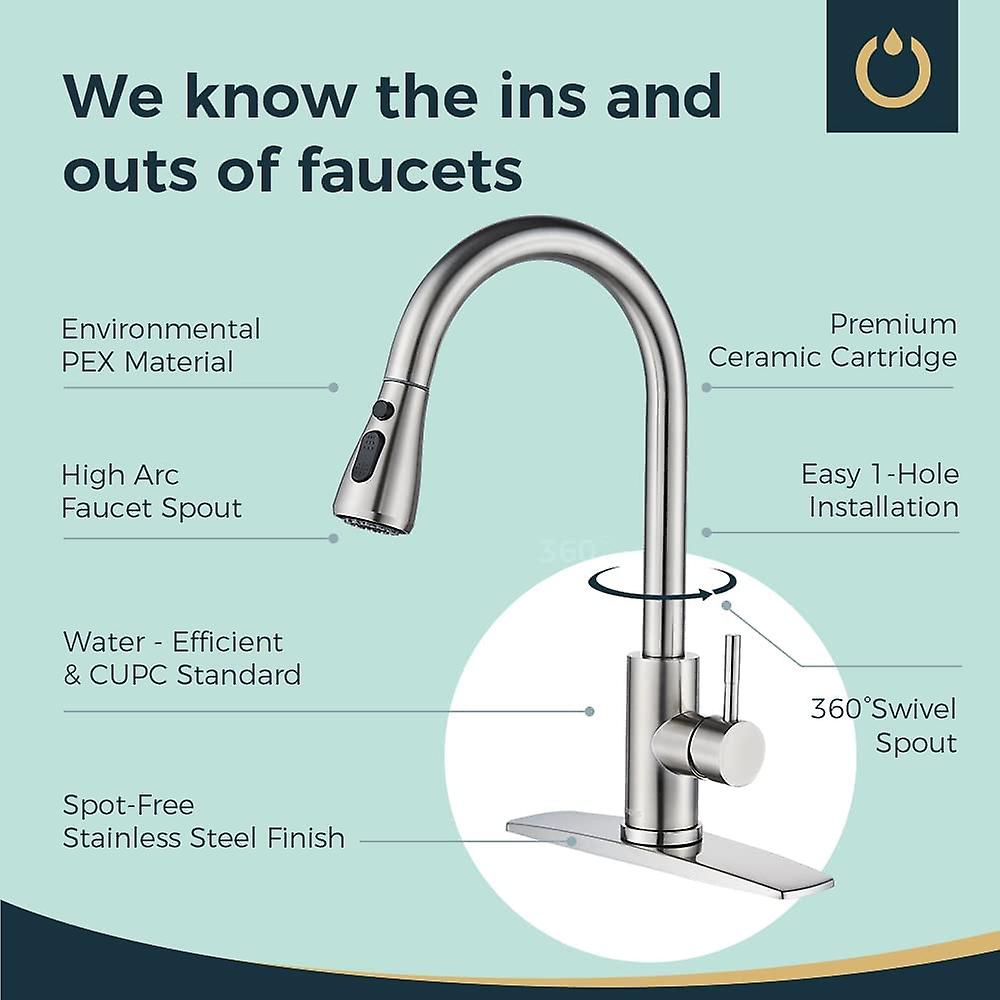 We develop kitchen faucets you can rely on, and we understand that functionality and reliability are achievable without dramatically higher prices. If you're looking for the perfect faucet, we've got you covered! The sprayer has push-button controls to switch from an aerated spray to a powerful spray, pause button capable of stopping the flow of water from the spray head without turning off the faucet. , The spout swivels 360 degrees to cover the entire sink. If you prefer a clean sink without a side spray or additional accessories, a pull-out faucet may be the right solution. faucet that will last up to 5 million uses. That's 10 times the industry standard, ensuring a lifetime of leak-free, trouble-free performance. The reflective finishes are plated and the brushed finishes use a process called physical vapor deposition (PVD) - both of which are to last a lifetime. This type of finish is perfect for resisting fingerprints and other stains. Braiding adds flexibility and durability.