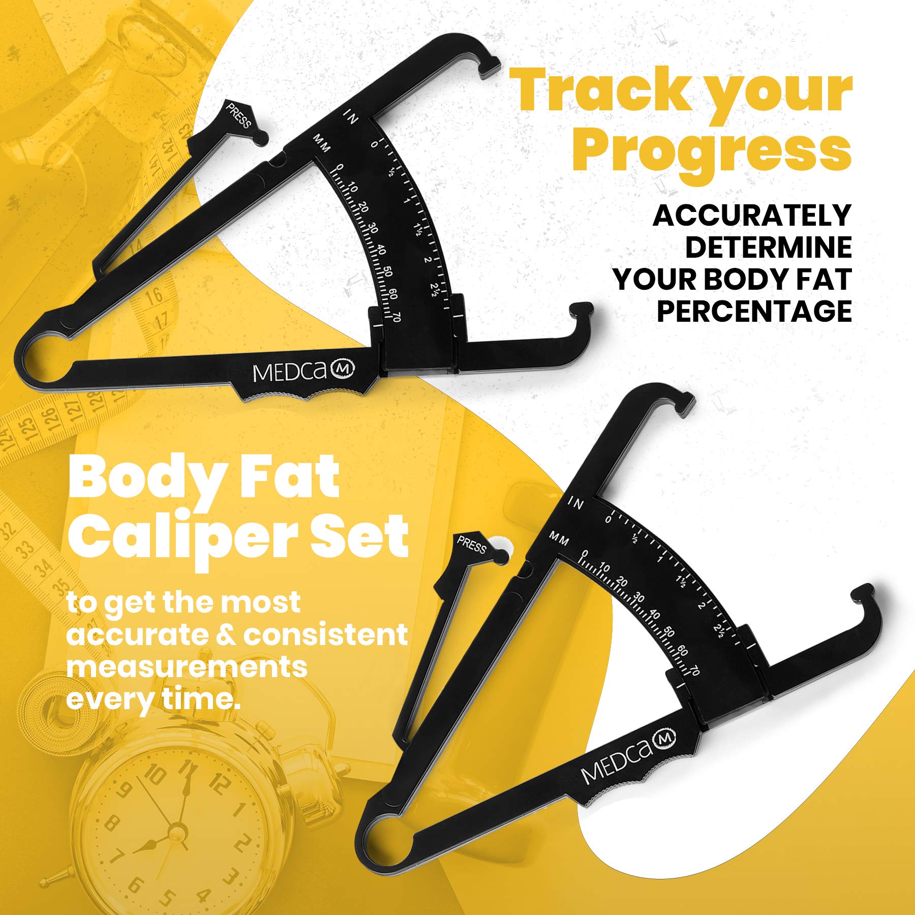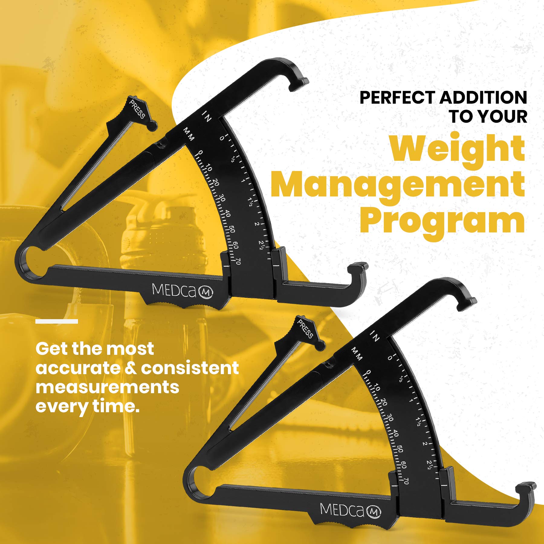 Studies have recently shown that your scale isnt always accurate at measuring whether or not youve lost fat. That's why the MEDca body fat caliper is the perfect weight loss aid! This skin fold caliper, BMI Measuring tool is the best tools of the trade when it comes to accurately and quickly measure your body fat, so that you can diet more accurately and lose weight fast. Each order includes 2 complete body fat calipers so you can keep one and give one to your friend or workout partner and that way can hold each other accountable for achieving your weight loss goals! Our body fat caliper is well worth every penny! Our body fat analyzer was made using durable materials and won't break easily. Because we make our body fat caliper in this unique way, it means that you'll be able to measure your body fat content with ease and accuracy.KEY FEATURES: 2 - body fat calipers with inches and mm Durable High Quality Easy to Use 100% Satisfaction d With MEDca your health care doesn't have to be stressful. If for whatever reason you are not 100% satisfied, we will do everything in our power to make sure that you leave happier and healthier.Why Wait? Click "Add to Cart" to order your new Body Fat Caliper today!