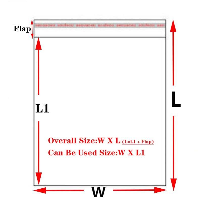 Color: TransparentThickness: 2 Mil \ 50 Micron \ 5 Wires \ 0.05 mm (Double Face)Material: Plasitc Opp (Oriented Polypropylene)How to use: These Have The Self Adhesive Strip On The Flap Of The Bag.Peel Off The Strip,And Fold The Top Over To The Body Of The Bag To Seal The Contents.Note:Length Includes Flap,So The Usable Size Need To Minus The Flap