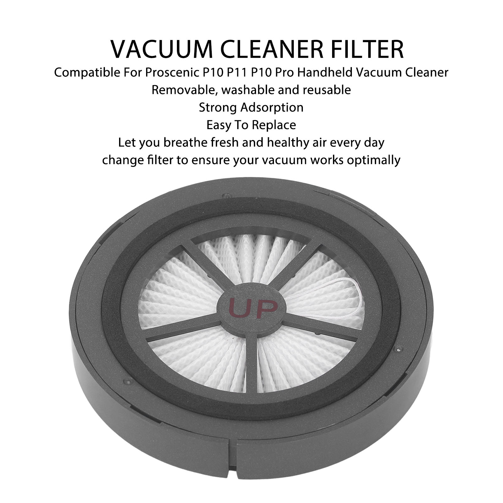 1Compatibility: The vacuum replacement filter compatible for Proscenic P10 P11 P10 Pro handheld vacuum cleaner. Please do check the model number for your vacuum cleaner before make the purchase. 2Clean and Efficient Filtration: The filters can keep your vacuum clean and efficient while reducing dust entering the air you breathe. 3Eco Friendly: Made with high strength and eco friendly ABS materials, the filter keep your household vacuum in optimal condition. 4Vacuum Cleaner Accessories Filter: Perfect replacement of old, damaged and unusable consumables extends the life of the vacuum cleaner. 5Regular Replacement for Optimal Performance: As part of normal maintenance, it can be easily removed and replaced. It is recommended to replace attachments every 2?3 months according to the frequency of use to keep the machine in optimum working order.