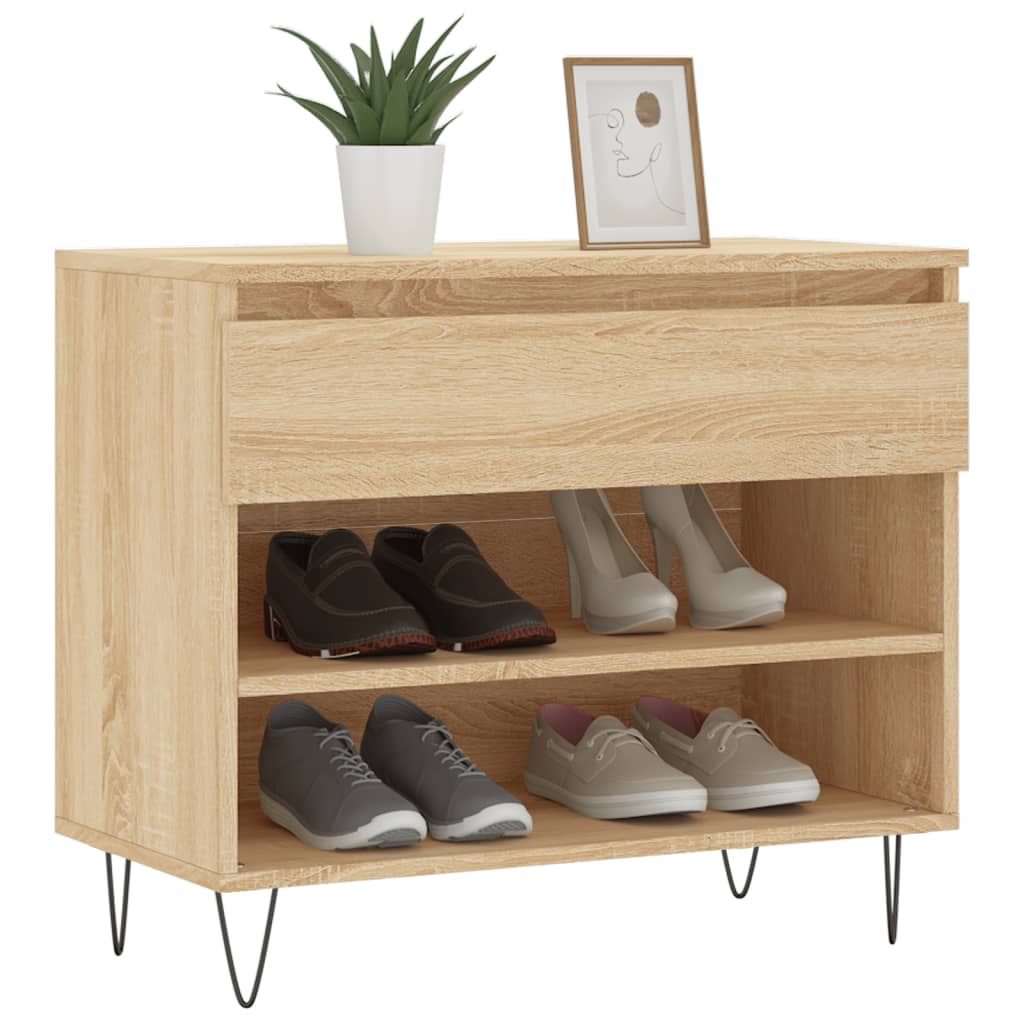 Keep your shoes away from dust and cluttering to create a tidy environment with this elegant shoe cabinet! Durable material: The engineered wood is of exceptional quality with smooth surface and also features strength, stability and resistance to moisture. Made of engineered wood, the shoe rack is easy to clean.Ample storage space: The shoe storage has 1 drawer and 2 open compartments, providing ample storage space for keeping your shoes and other items well organised.Sturdy top: The top of the shoe cupboard is ideal for displaying decorative objects, photo frames, or potted plants.Metal legs: The metal legs add a modern and calm style to your interior while ensuring stability. Warning:To prevent it being overturned, this product must be used with the provided wall attachment device.