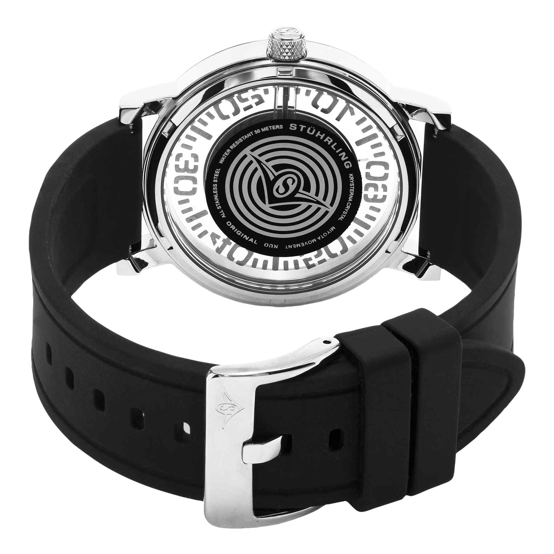 Silver Tone Case on Black High Grade Silicone Rubber Strap, White Skeletonized Spoke-Style Movement, with Silver Tone and Black Accents