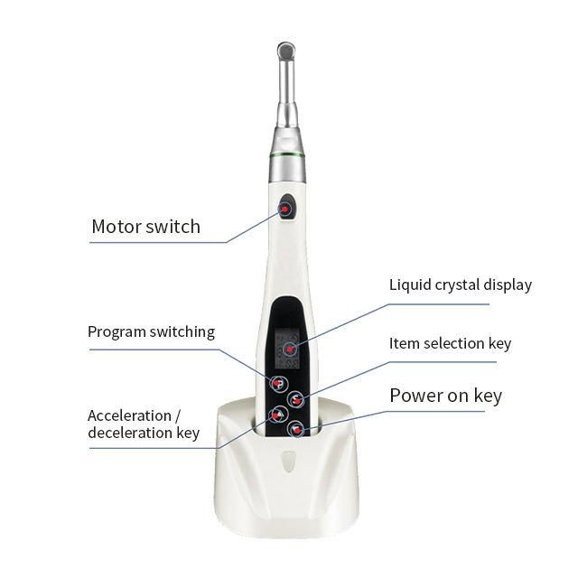Best Selling D-smart Dental 16:1 Endo Motor with led wireless endomotor6 programs with led wirelessRoot canal apex locator is an endodontic treatment equipment,which is converted into mechanical energy from the electricalenergy and meets the goal of root canal mechanical expansionthrough the mechanical motor drive, micro-control. This machineisAIO for handheld operation.This equipment is a special device for dental use. Do not usethis equipment in other places.Suitable Scope:Root canal apex locator applies to root canal mechanicalexpansion of dentalrootcanaltherapy. It is used for pulpnecrosis, chronic gingival periapical periodontitis, chronicperiapical periodontitis(including periapical granuloma,periapicalabscess and periapical cyst), teethwithpulpalperiodontalsyndrome and systemic disease that is not suitabletoextract a tooth but need for treatment or temporaryretentionof the root canal mechanical expansion.Feature:1. The product is based on ergonomic design whose body is lightweight and is easy to carry.2. When operating, using mini push - button 20: 1 (left and right reciprocating)Dental Contra-angle Handpiece to coordinate the machine files(hand files).3. There are 6 kinds of procedures (Memory Set) for selection. It can input the optimum data in advance, and also can modify it according to the working conditions in use.4. According to the set load point, it can automatically reverse and stop working and is able to remember different actions of each program.5. Soft start and soft stop can be achieved and the operation is more comfortable. Simultaneously, it won t break the needle when root canal files encounter instantaneous shock.6. Dental Contra-angle Handpiece and lamp holder can withstand 135 high temperature and high pressure sterilization.7. Built-in high-capacity lithium battery, so it can reduce battery change times and reduce costs for the machine.8. There is a voice prompt when lack of power.9. With LED lamp and high brightness, it can help doctors get a better look at the root canal environment.Technical parametersMain unit voltage: 3.7V DC Battery capacity :800 mAh Charger input voltage: AC110-220V. 50/60HZ Charger output voltage :5V DC Input voltage: 1.0A
