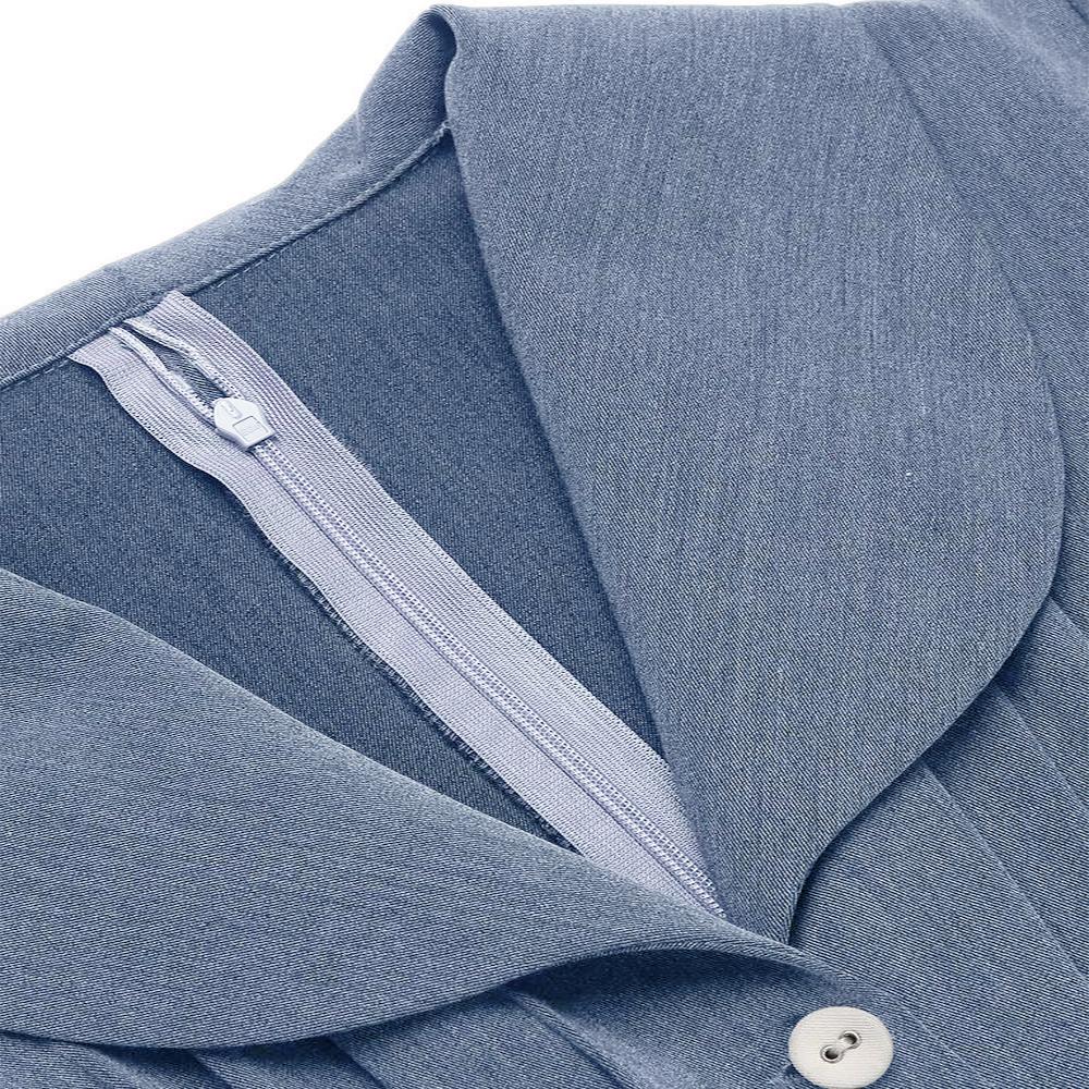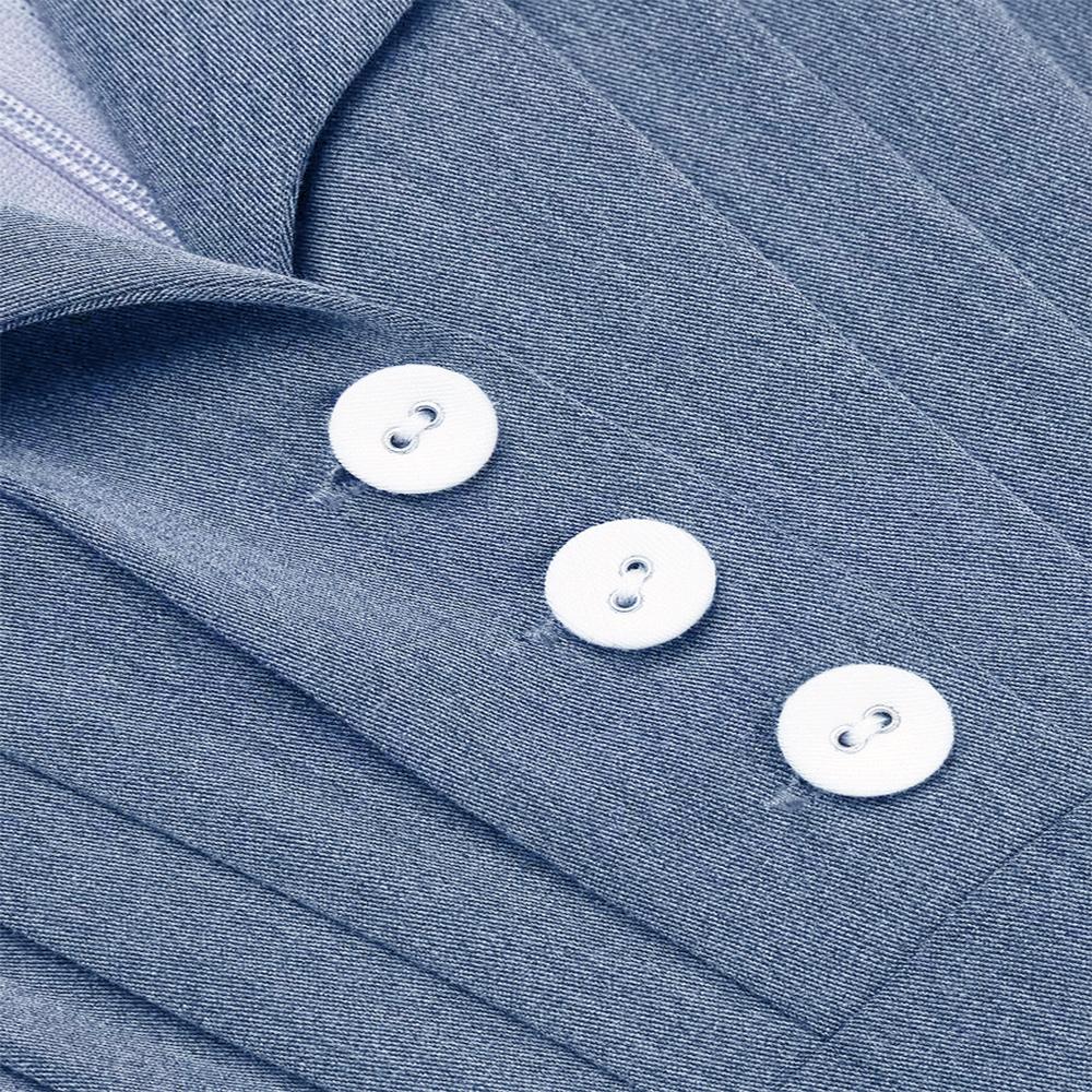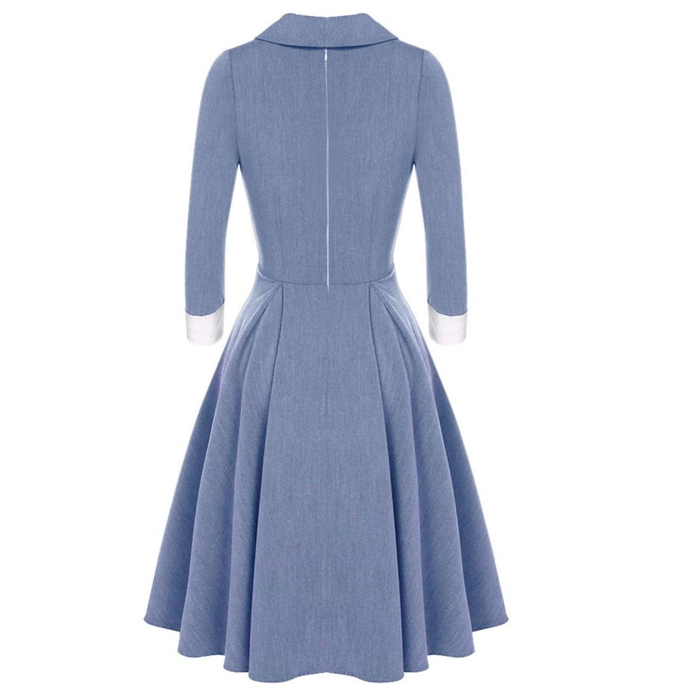 PRODUCT DETAILSLabel: YesBrand: Bright DeerGender: Women, FemalePattern Type: Stitching, Denim Blue with White Color blockStyle: Swing, Skater, A-Line, Empire, CocktailSilhouette: Fit and Flare, Swing, Shift, Classic, Regular fitOccasion Lifestyle: Ceremony, Evening, Party, Cocktail, Festival, Wedding, Birthday, Anniversary, Christmas, New Year etcWaistline: Fitted / Cinched waistSleeve type: 3/4 sleevesMaterial: 65% Polyester, 30% Cotton, 5%SpandexDresses Length: Mid-calfSeason: Spring, Summer, Fall, Autumn, WinterCare Instruction: Machine wash with similar colours / Do not bleach, dry clean or tumble dryPackage includes: 1 piece of dressWashing care: Machine wash, gentle cycle, do not bleach, do not tumble dry, do not iron-Peter Pan Collar, V-neck, Cinched waist, Zip back-Fit-and-flare style, Regular fit-Denim Blue color, vintage style. The dress have western wild and elegant both. Special beautiful dress will make you looks great whatever the occasion.SIZE TABLESize S -- Length: 106cm, Bust: 88cm, Waist: 68cm, Sleeves:43cmSize M -- Length: 107cm, Bust: 93cm, Waist: 73cm, Sleeves:43.5cmSize L -- Length: 108cm, Bust: 98cm, Waist: 78cm, Sleeves:44cmSize XL-- Length: 110cm, Bust: 104cm, Waist: 84cm, Sleeves:44.5cmSize XXL--Length: 112cm, Bust: 112cm, Waist: 92cm, Sleeves:45cm