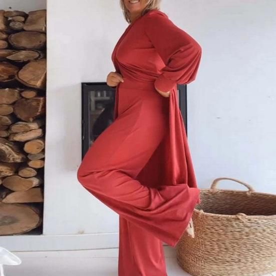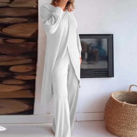 Features: This women's casual two-piece set has a casual design, including a commuter long-sleeved top and wide-leg trousers, suitable for most body shapes and showing your unique charm.Material: 95% polyester, 5% spandex Made of high-quality fabric that is breathable, wrinkle-free, durable, easy to iron, and flexible.Irregular Hem: The irregular hem is the biggest feature of this suit which makes you look fashionable and chic. Pair with: This is a beautiful set for women who like a simple and casual style. It can be easily paired with high heels, sandals, jackets, and windbreakers to create a fashionable and beautiful look. Can be matched with anything you like, such as necklaces, watches, bracelets, earrings, rings, fashionable satchels, etc.Occasion: A simple and elegant casual suit is not only a must-have for your wardrobe, but also a perfect choice for work, parties, vacations, study, home, and dates.Description:Elevate your summer wardrobe with this fashionable 2-piece suit, designed for comfort and style. Crafted from a blend of 95% polyester and 5% spandex, this casual ensemble features a long-sleeved top and wide-leg trousers that flatter various body shapes. The breathable and wrinkle-free fabric ensures durability and easy maintenance, making it a versatile addition to your closet. Pair it effortlessly with high heels, sandals, or jackets for a chic look suitable for work, parties, or casual outings. Embrace simplicity and charm with this versatile outfit, perfect for any occasion. Ideal as a gift for your loved ones, this set exudes elegance and sophistication, enhancing your overall appeal.Item Name: Blouse Pants Set Material: PolyesterGender: WomenStyle: CasualTop Length: Long Pants Length: Full LengthSize Type: Plus Size Season: Summer, Spring, Fall Collar: Stand CollarSleeve: Long SleevesFeatures: Wide Leg, Adjustable Waist, Irregular Hem Size Details:Size: M, Bust: 105cm, Clothes Length: 121cm, Sleeve: 51cm, Waist: 75cm, Hip: 105cm, Pants Length: 111cm(Approx.)Size: L, Bust: 109cm, Clothes Length: 122cm, Sleeve: 52cm, Waist: 80cm, Hip: 110cm, Pants Length: 112cm(Approx.)Size: XL, Bust: 113cm, Clothes Length: 123cm, Sleeve: 53cm, Waist: 85cm, Hip: 115cm, Pants Length: 113cm (Approx.)Size: 2XL, Bust: 117cm, Clothes Length: 124cm, Sleeve: 54cm, Waist: 90cm, Hip: 120cm, Pants Length: 114cm(Approx.)Size: 3XL, Bust: 121cm, Clothes Length: 125cm, Sleeve: 55cm, Waist: 95cm, Hip: 125cm, Pants Length: 115cm (Approx.)Size: 4XL, Bust: 125cm, Clothes Length: 126cm, Sleeve: 56cm, Waist: 100cm, Hip: 130cm, Pants Length: 116cm(Approx.)Notes:Please refer to our size chart and choose the right size.Due to the light and screen setting difference, the item's color may be slightly different from the pictures.Package Includes:1 x Top1 x Pants