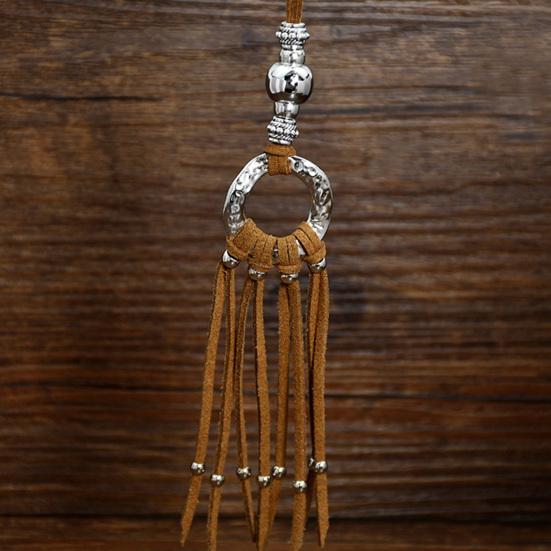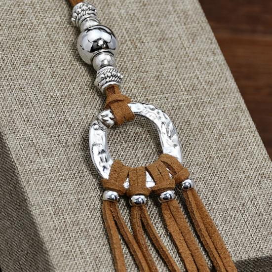Item Name: NecklaceGender: WomenStyle: BohemianFeatures: Tassels, Metal Ring, LongSize Details:Chain Length: 80cm/31.5" (Approx.)Pendant Length: 14cm/5.51" (Approx.)Specifications: It is made of high-quality faux leather and alloy material.Very stylish and trendy thanks to the faux leather design, this long necklace allows you to look cool and more elegant.Length of the chain is about 80cm, pendant length is 14cm.Long necklace is suitable for leisure, weddings, parties, vacations, streetwear, daily life, etc.In addition, the metal ring and tassel pendants are beautifully designed and would make a great addition to your outfit.Notes: Due to the light and screen setting difference, the item's color may be slightly different from the pictures.Please allow slight dimension difference due to different manual measurement.Package Includes: 1 x Necklace